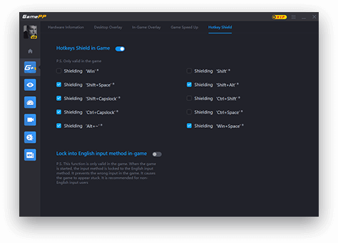 該功能解決了玩家在游戲過程中可能由于部分系統(tǒng)熱鍵導(dǎo)致操作失誤的問題。玩家可根據(jù)自身需求來選擇屏蔽以下一些熱鍵“shift"黏貼鍵、“Win”鍵、“Ctrl+Shift"輸入法切換熱鍵、“Ctrl+Space”鍵、“Alt+~”鍵等,還能設(shè)置在游戲中默認(rèn)切換為英文輸入法功能,以免在激烈的操作中誤觸了熱鍵功能造成不必要的損失。