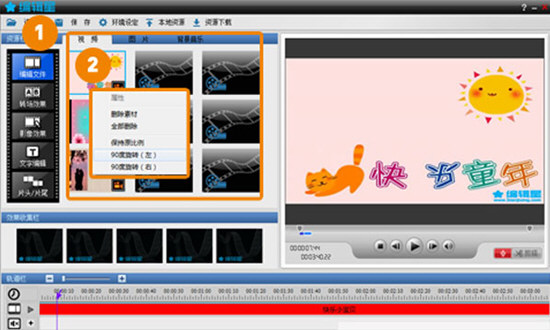 2、編輯星自帶各種效果素材,包含轉(zhuǎn)場(chǎng)效果、影像效果、文字效果、背景音樂(lè)及錄音等,可以自由插入和重疊使用。