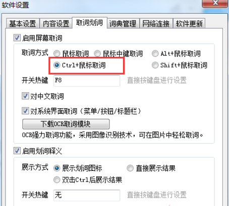 3.如果對(duì)于軟件任意單詞自動(dòng)翻譯這一功能感覺(jué)不太習(xí)慣,可以在軟件的具體設(shè)置中按照喜好重新設(shè)置【屏幕取詞】的相關(guān)設(shè)置