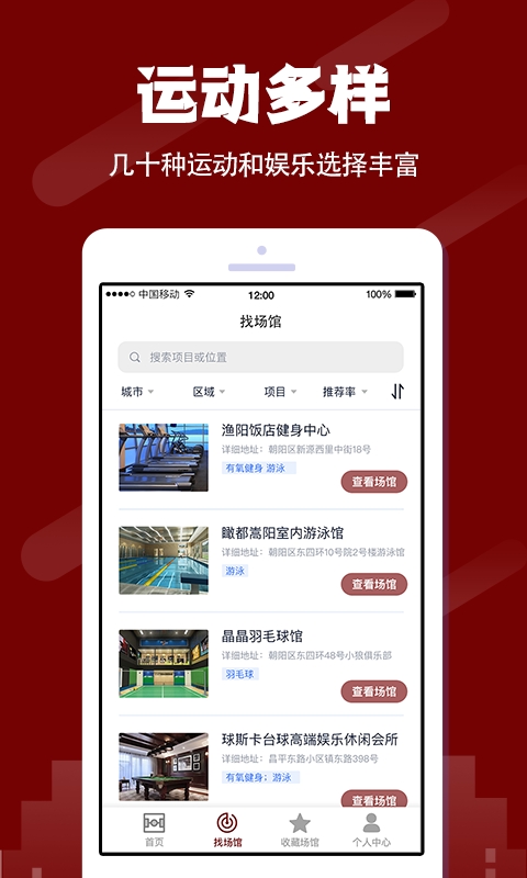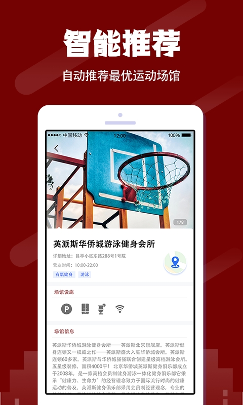 軟件會(huì)根據(jù)您的定位,自動(dòng)給您推薦距離更近,口碑更好,評(píng)分更高的運(yùn)動(dòng)場(chǎng)館,同時(shí)為您智能導(dǎo)航,讓您可以簡(jiǎn)單方便的找到!