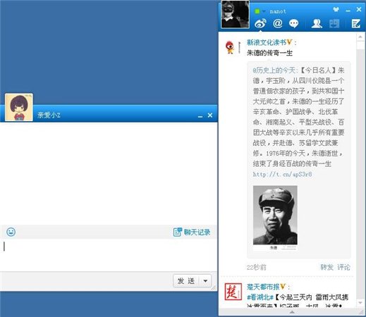您可以通過微博桌面與微博好友即時通訊聊天,隨時與好友聯(lián)絡感情;及時與好友互動,分享新鮮事兒。 微博就在你桌面,分享常在你手邊。