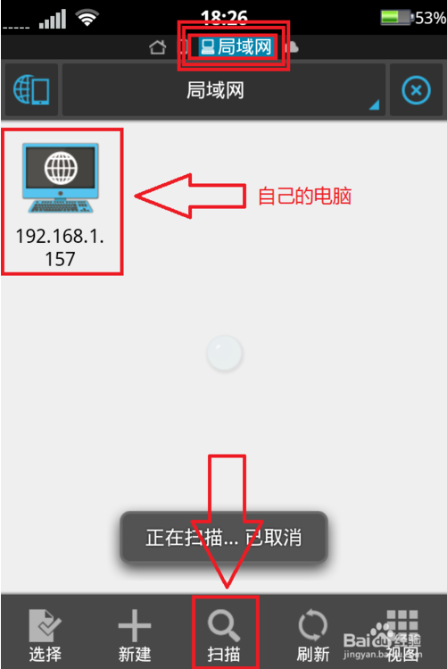 找到局域網(wǎng)頁面,點掃描,會找到你的電腦,如圖!