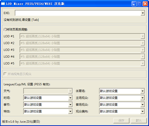 第二步:打開“LOD Mixer 1[1].6中文版”工具,選擇你的WE8.exe文件位置,即實況根目錄/WE8.exe,門將球員畫質(zhì)調(diào)整LOD#1-5全部選擇:#1:超高畫質(zhì)(512*256)大貼圖,之后點擊保存即可。