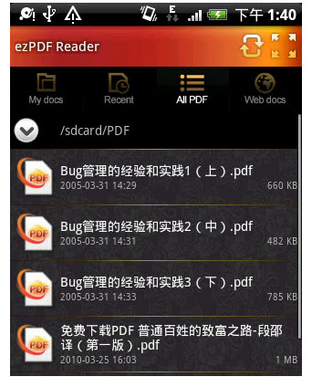 ezPDF Reader是一款PDF、ePub閱讀與編輯器。需要2.1以上ROM支持,可將文本單獨(dú)提取出來并且以適應(yīng)屏幕的方式瀏覽。這款軟件支持多點(diǎn)觸控,以及頁面滾動,支持書簽、超鏈接及列表瀏覽,還能打開加密的PDF文件,翻頁時還有動畫效果,速度也非常不錯。