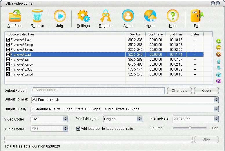 Ultra Video Joiner是一個幫助你連接或者合并AVI/DivX,MPEG I/II,VOB,DAT,WMV,ASF視頻文件到一個大的各種格式的視頻文件合并軟件。