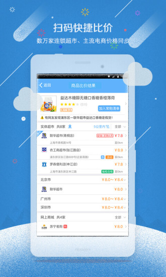 3、和一號店、亞馬遜等超市的數(shù)據(jù)對接,掃一掃商品就能及時(shí)了解各種促銷價(jià)格信息。