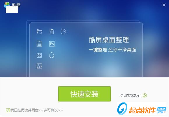 在起點(diǎn)軟件園下載并雙擊該軟件,這時(shí)候,我們就進(jìn)入了酷屏的安裝向?qū)?。安裝向?qū)е鹘缑娣浅:?jiǎn)潔,安裝程序默認(rèn)用戶同意了許可協(xié)議,只需點(diǎn)擊[快速安裝],就可以將酷屏安裝到電腦里面;