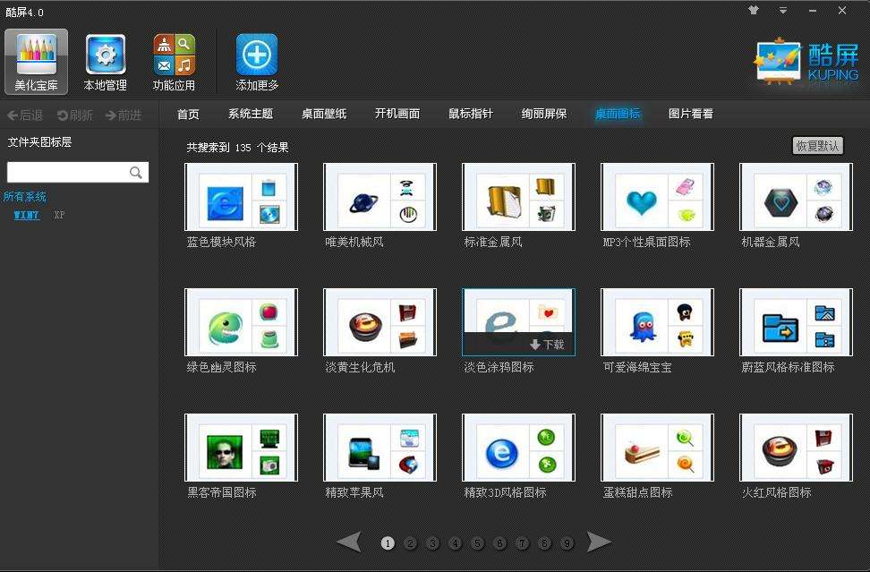 酷屏為您提供全部資源免費(fèi)下載,鼠標(biāo)點(diǎn)擊,桌面立即應(yīng)用。 3)一鍵恢復(fù)當(dāng)前使用的默認(rèn)資源 如果您使用了當(dāng)前資源不是很滿意,想恢復(fù)到開(kāi)機(jī)使用時(shí)的資源,您可以點(diǎn)擊“恢復(fù)默認(rèn)”按鈕,桌面立即恢復(fù)回到當(dāng)前使用的資源