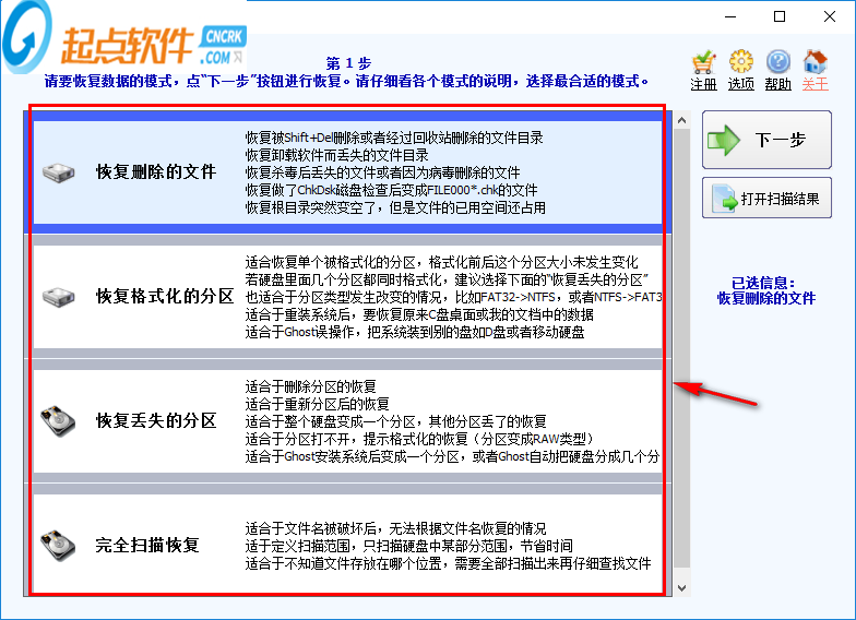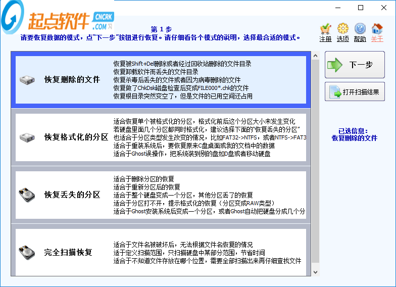 2、選擇恢復(fù)模式,其提供了恢復(fù)刪除的文件、恢復(fù)格式化的分區(qū)、恢復(fù)丟失的分區(qū)等多種不同的類型,用戶可以根據(jù)自己的恢復(fù)類型來選擇相應(yīng)的恢復(fù)模式(選擇恢復(fù)類型可參考模式右側(cè)的信息),選擇后點擊【下一步】繼續(xù)。