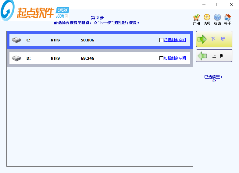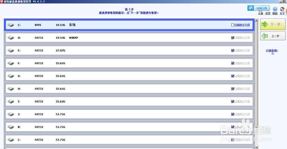 3、彈出了如下的選擇要恢復(fù)的盤符,我們選擇相應(yīng)的磁盤分區(qū)(即丟失數(shù)據(jù)的存儲磁盤分區(qū)),然后點擊下一步。