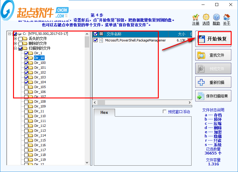 6、勾選要恢復(fù)的目錄或者文件,然后點擊【開始恢復(fù)】按鈕,等待恢復(fù)完成,其還提供了查找文件、預(yù)覽文件、重新掃描等功能。