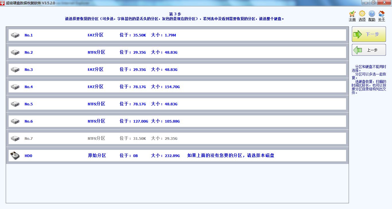超級硬盤數(shù)據(jù)恢復(fù)軟件可以對任何一個無分區(qū)或者分區(qū)表損壞或者重新分區(qū)過的硬盤,能在幾分鐘內(nèi)對全盤進(jìn)行閃電掃描分區(qū)信息,列出全部分區(qū) 進(jìn)行恢復(fù)。掃描到的分區(qū)能夠和當(dāng)前正常的分區(qū)區(qū)分開并以藍(lán)色粗體高亮提示,閃電掃描分區(qū)的算法能夠?qū)BR分區(qū)表和GPT分區(qū)表同時掃描,比別的恢復(fù)工具 節(jié)省很多時間。