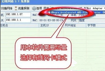 3.在主界面的“網(wǎng)卡”中,選擇接入局域網(wǎng)所用的網(wǎng)卡。如果同時(shí)可以使用無(wú)線連接和有線連接,那么建議在“網(wǎng)卡”中選擇有線網(wǎng)卡,而不要使用無(wú)線網(wǎng)卡,這點(diǎn)請(qǐng)大家記住了。因?yàn)橐暵酚善鞑煌?,幻境網(wǎng)盾使用無(wú)線網(wǎng)卡可能根本無(wú)法控制別人的網(wǎng)速