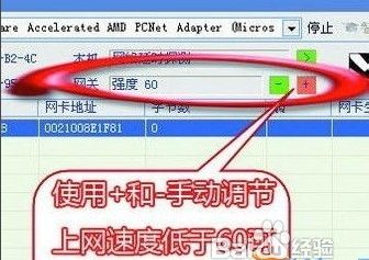 那么如何手動(dòng)控制客戶機(jī)的上網(wǎng)呢?網(wǎng)關(guān)一欄的IP和MAC地址后面有個(gè)“網(wǎng)關(guān)”的選項(xiàng),點(diǎn)擊+或者-號(hào),強(qiáng)度后面出現(xiàn)數(shù)字。當(dāng)調(diào)高到60的時(shí)候,被控制電腦幾乎上不了網(wǎng)了。