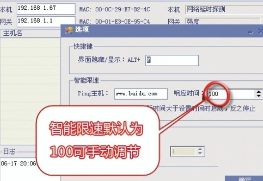 使用之前,第一次運(yùn)行幻境網(wǎng)盾會(huì)彈出一個(gè)“選項(xiàng)”設(shè)置窗口,這里可以設(shè)置界面隱藏快捷鍵、智能限速的設(shè)置、ARP防火墻等。智能限速的默認(rèn)響應(yīng)時(shí)間是100ms,對(duì)于懶人或者小菜鳥來(lái)說(shuō),直接使用默認(rèn)值就可以了。
