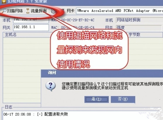4.點(diǎn)擊“掃描網(wǎng)絡(luò)”或者“流量探測(cè)”來(lái)實(shí)現(xiàn)檢測(cè)局域網(wǎng)中的電腦。為了保密起見(jiàn),建議選擇“流量探測(cè)”。如果“流量探測(cè)”找不到要控制的電腦,在檢查網(wǎng)關(guān)的IP地址沒(méi)有錯(cuò)誤之后,才使用“掃描網(wǎng)絡(luò)”功能。也可以在主機(jī)列表上點(diǎn)擊右鍵選擇“添加主機(jī)”手動(dòng)添加要控制的電腦。