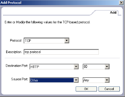 高級(jí)規(guī)則的名字和描述自己填寫, Action 選擇 Block,Source是指訪問本機(jī)的機(jī)器,若要阻止指定 IP 訪問本機(jī)的 80 端口,在里面添加 IP 即可,Destination是本地的 IP 地址,將本地的 IP 地址添加進(jìn)去即可, Protocol 協(xié)議的設(shè)置如下所示: