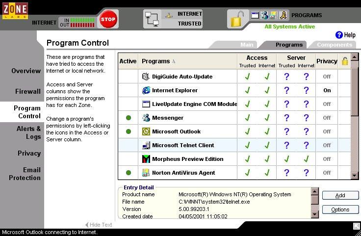 ZoneAlarm又叫ZA防火墻是一款老牌的防火墻產(chǎn)品,非常適合家庭個(gè)人用戶的使用,可以有效的保護(hù)計(jì)算機(jī)的安全免受病毒感染。該軟件能夠監(jiān)視來自網(wǎng)絡(luò)內(nèi)外的通訊情況,同時(shí)兼具危險(xiǎn)附件隔離、cookies保護(hù)和彈出式廣告條攔截等六大特色功能,能夠有效的預(yù)防電腦病毒。另外軟件本身帶有一個(gè)簡單的使用教程,可以幫助用戶快速上手。當(dāng)有程序想要存取Internet時(shí),如網(wǎng)絡(luò)瀏覽器可能會(huì)出現(xiàn)連不上網(wǎng)絡(luò),這時(shí)你可以通過ZA防火墻設(shè)置程序的上網(wǎng)權(quán)限,從而防止一些來路不明的軟件偷偷上網(wǎng)。
