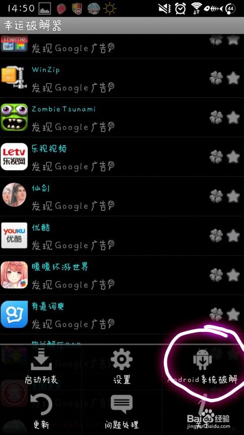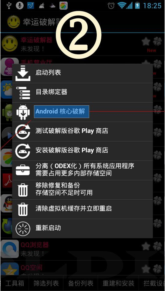 點擊手機菜單鍵(不同機型的菜單鍵不相同),點擊畫圈處Android系統(tǒng)破解。