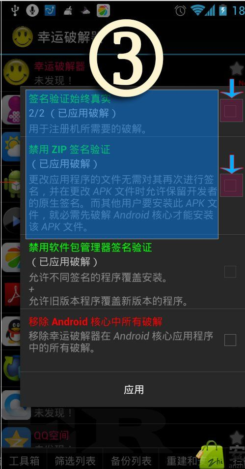 點擊進入該界面,勾選前兩項,選擇應(yīng)用,重啟手機。