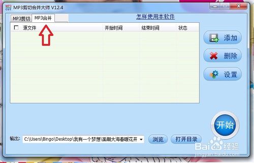 打開作業(yè)界面,點(diǎn)擊如圖箭頭所示“MP3合并”選項卡