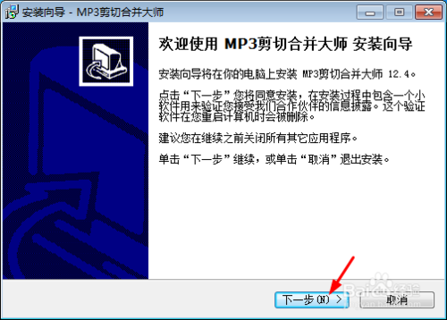 打開下載好的MP3剪切合并大師,進(jìn)入安裝界面,點(diǎn)擊下一步