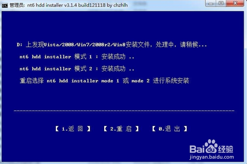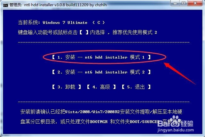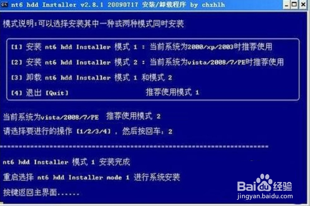之后,雙擊運(yùn)行解壓后的nt6 hdd installer.exe,會(huì)出現(xiàn)模式說(shuō)明:可以選擇其中一種或兩種安裝。由于當(dāng)前我的系統(tǒng)是win7,根據(jù)提示,輸入2,然后回車(chē)。