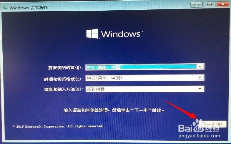 這就是重啟之后進(jìn)入安裝程序的畫(huà)面。按圖所示填寫(xiě),然后下一步。