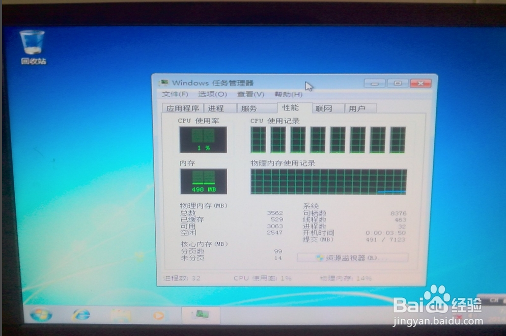 之后,啟動(dòng)就成功了。如下圖,進(jìn)入桌面。打開(kāi)任務(wù)管理器,發(fā)現(xiàn),使用內(nèi)存才498M,說(shuō)明新系統(tǒng)很干凈!