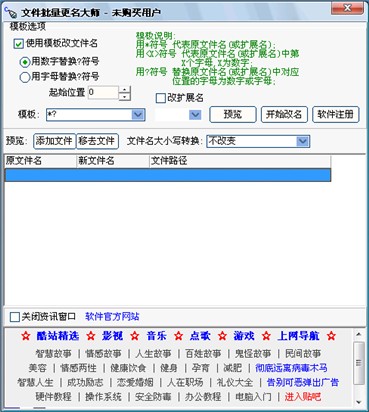 文件批量更名大師 V3.35 綠色特別版 本軟件是一款極好的文件批量改名工具,他可以輕松的幫助你完成各種形式的文件批量改名工作。您不妨下載試試,相信您一定會喜歡它的^_^