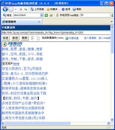 3gqq電腦登陸瀏覽器特點:打開網(wǎng)頁速度快,支持打開各種wap手機網(wǎng)站,玩各種手機網(wǎng)頁游戲,占用的硬盤空間極小,同時也減少瀏覽器對系統(tǒng)資源的占用率,操作簡單,界面美觀, 讓您更快速、輕松且安全地使用網(wǎng)絡(luò)。用電腦上WAP網(wǎng)頁,直接在電腦上瀏覽Internet觀看WAP網(wǎng)頁的內(nèi)容 ,玩游戲,樣樣齊全,3gqq電腦登陸瀏覽器已成為廣大網(wǎng)民使用瀏覽器的第一選擇。
