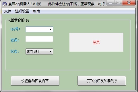打開晨風(fēng)qq聊天機(jī)器人后,界面輸入QQ賬號(hào)及密碼即可登陸。