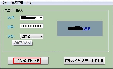 登陸QQ成功后,即可點(diǎn)擊“設(shè)置自動(dòng)回復(fù)內(nèi)容”進(jìn)行設(shè)置。