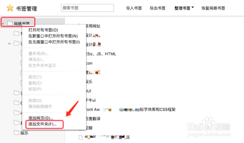 如何在網(wǎng)絡(luò)書簽中新建文件夾呢?選中【網(wǎng)絡(luò)書簽】文件夾,右鍵單擊找到【添加文件夾】,這樣就會建立屬于網(wǎng)絡(luò)書簽的子類文件夾,可以對新建文件夾進行重命名