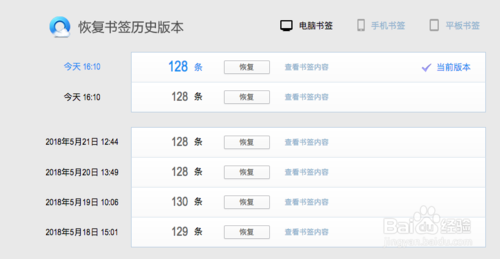 最后,可以對書簽進行恢復(fù)歷史版本,共分為三種類型,電腦書簽、手機書簽和平板書簽。如圖所示,電腦書簽中可以看到我們對書簽的管理變更時間,點擊【查看書簽內(nèi)容】灰色文字可以看到歷史添加的書簽信息,點擊相應(yīng)【恢復(fù)】的按鈕就會對當前日期的書簽條數(shù)進行恢復(fù)管理,是不是很人性化呢?