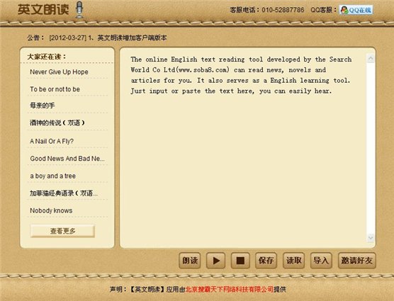 大家可以用他來讀新聞、讀小說、讀文章,更重要的是你可以利用本工具練習英語發(fā)音、聽力,學習不摻雜任何中國式口音的純正英語。