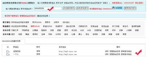 輸入框上輸入你朋友的QQ號碼,然后“點擊查詢音樂”按鈕,在下面的列表上可以看到你朋友的qq空間背景音樂。把你喜歡的那首克隆到自己的空間上。