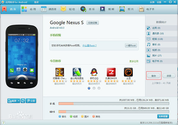 1、備份手機數(shù)據(jù)(重要!)如果數(shù)據(jù)已經(jīng)完成備份,請?zhí)^步驟1數(shù)據(jù)備份建議使用應(yīng)用助手,在電腦上安裝應(yīng)用助手,將手機通過usb連接到電腦上,出現(xiàn)如下界面,點擊備份。