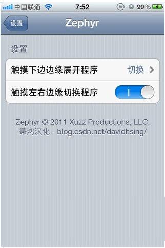 Zephyr有兩項(xiàng)主要功能,第一項(xiàng)就是能夠讓用戶在iPhone屏幕上通過左/右滑在打開的應(yīng)用程序之間進(jìn)行切換;另一項(xiàng)就是上拉功能——用戶只要在屏幕底部向上劃動手指,就可以看到后臺當(dāng)中的多任務(wù)菜單欄。親測可用,必須重啟兩次才能起作用!