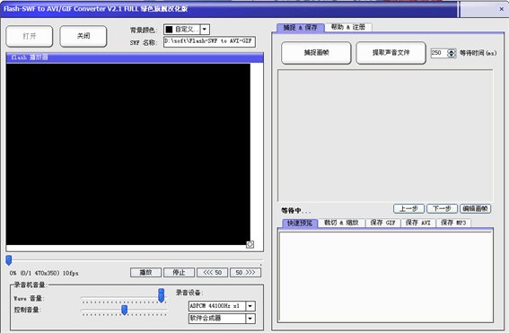 Flash-SWF to AVI-GIF Converter 可以將 flash/SWF 文件轉(zhuǎn)換成為 GIF、AVI、MP3文件的一款實用軟件, 功能強大,操作簡單,附漢化補丁附注冊碼。
