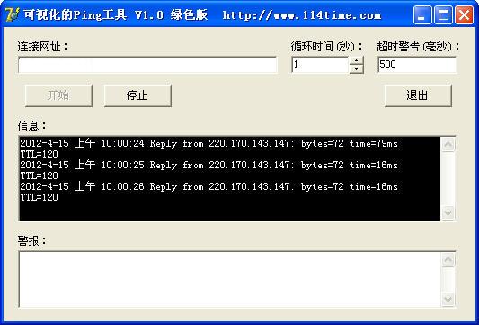 可視化的Ping工具 快捷方便的可視化執(zhí)行Ping命令,輸入網(wǎng)址,配置好循環(huán)時間和超時時間,程序可以定時對網(wǎng)址進行Ping操作,并返回操作結果。