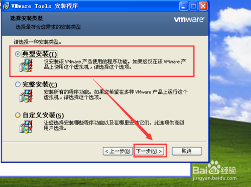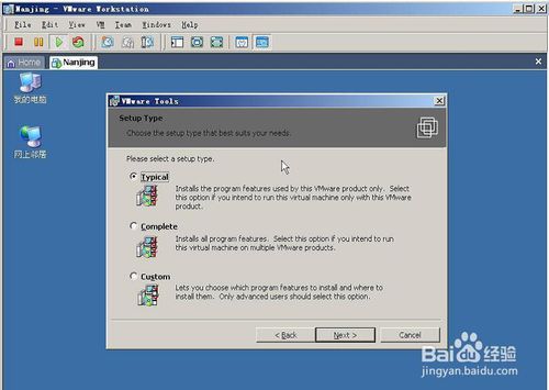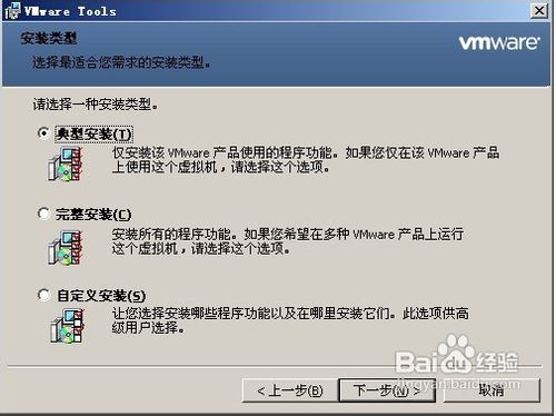 3 接著就是下一步下一步了,其中有一個(gè)界面是讓我們選擇安裝類型的(如下圖所示),一般我們選擇典型安裝,當(dāng)然如果你對VMtools比較了解的話,也可以選擇自定義安裝(一般都是在此VM上運(yùn)行,應(yīng)該沒有人跨VM運(yùn)行吧,因此完成安裝不必考慮)。