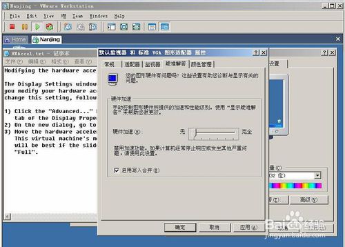 然后跳出了配置“硬件加速”的顯示屬性窗口和配置過程的文擋。具體界面如下圖:可以上圖左邊文檔的步驟來把“硬件加速”設(shè)置成“完全” ,其實(shí)很簡單,只要點(diǎn)擊“顯示屬性—>設(shè)置”中的“高級” ,然后出現(xiàn)如下圖: