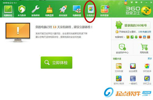 2、 在電腦上,打開360安全衛(wèi)士,找到360手機助手,點擊“立即連接”。如果你的電腦沒有安裝360手機助手,它自動安裝,手機也是一樣的。當然,如果你不需要,我們ROOT后,可以進行卸載。如下圖。