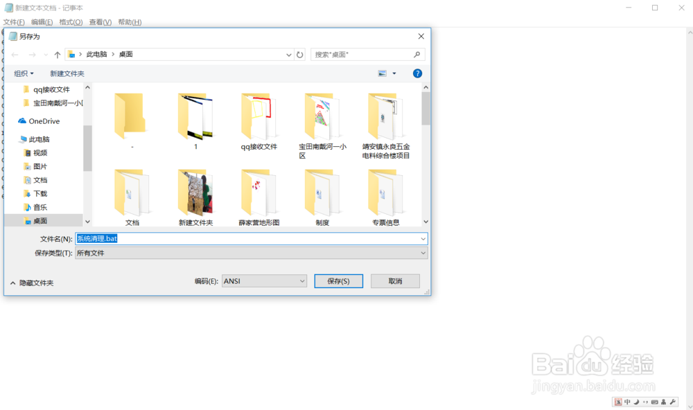 3、記事本另存為“系統(tǒng)清理.bat”(文件名可自定,文件擴展名必須是.bat),另存為時“保存類型”選擇“所有文件”