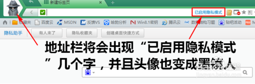 這時(shí),將會(huì)新打開(kāi)一個(gè)瀏覽器窗口,并且該窗口的地址欄有“已啟用隱私模式”幾個(gè)字,而且頭像圖標(biāo)也變成了一個(gè)戴墨鏡的俠客。