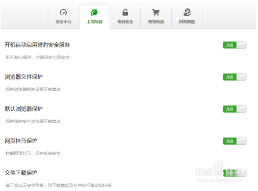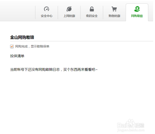 在“網(wǎng)購(gòu)敢賠”一欄中,可以設(shè)置是否開(kāi)啟“金山網(wǎng)購(gòu)敢賠保單”。