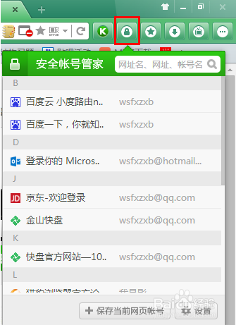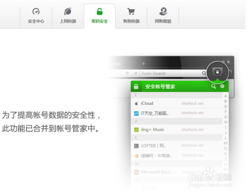 切換到“密碼安全”一欄,會(huì)提示此功能已合并到帳號(hào)管家中。帳號(hào)管家可點(diǎn)擊瀏覽器右上角的鎖型圖標(biāo)打開(kāi)。
