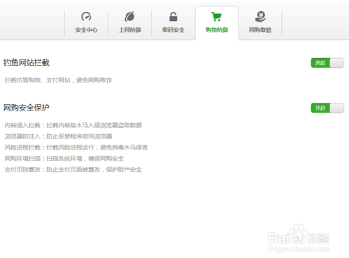 在“購(gòu)物防御”一欄中,可開(kāi)啟“釣魚網(wǎng)站攔截”和“網(wǎng)購(gòu)安全保護(hù)”。