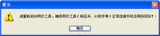 3、稍等片刻,這時(shí)候會(huì)出現(xiàn)“請(qǐng)重新啟動(dòng)同步工具,確保同步工具正常連接手機(jī)”字樣的對(duì)話畫。這時(shí)先別點(diǎn)界面的確定按鈕。